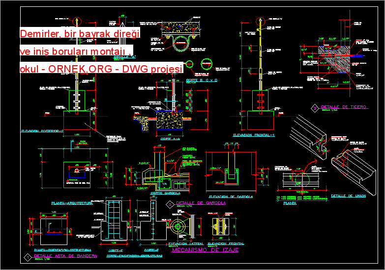 Demirler, bir bayrak direği ve iniş boruları montajı , okul dwg projesi